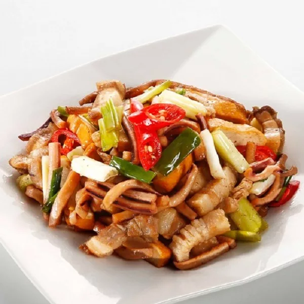 客家小炒(300g):五花肉條、豆干、青蔥、蒜頭、魷魚、辣椒